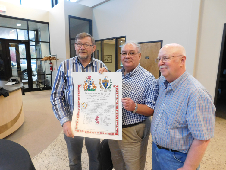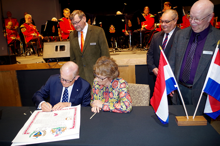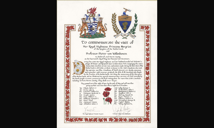 The scroll of remembrance, presented to H.R.H. Princess Margiet and her husband, Professor Pieter Van Vollenhoven for signature, is an original piece of heraldic artwork to commemorate the couple's official visit to Goderich, and to honour the "Huron County 20" who laid down their lives during the campaign to free the Netherlands from Nazi occupation.